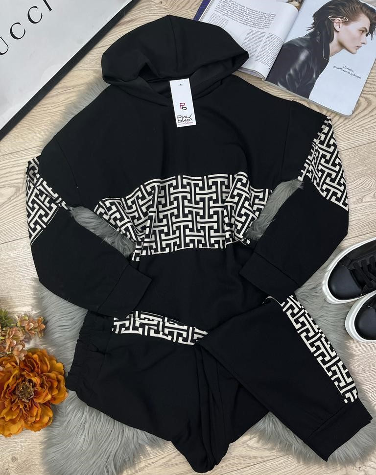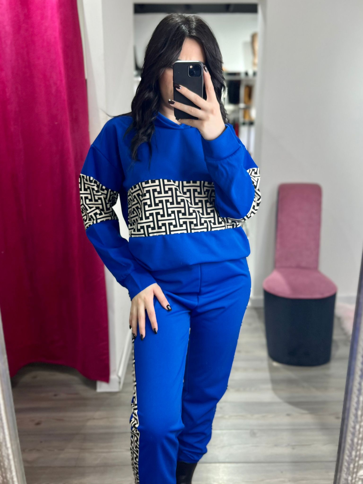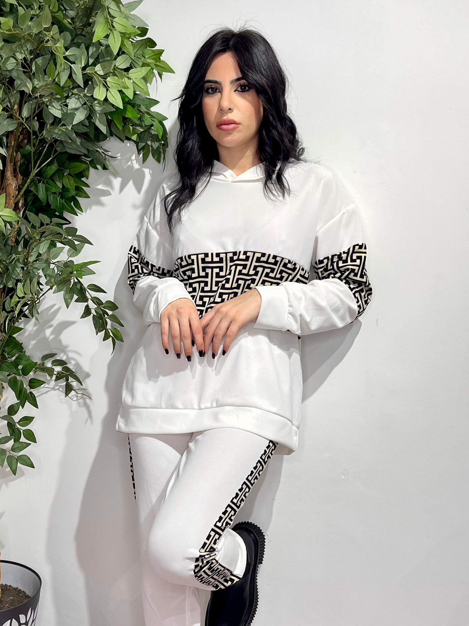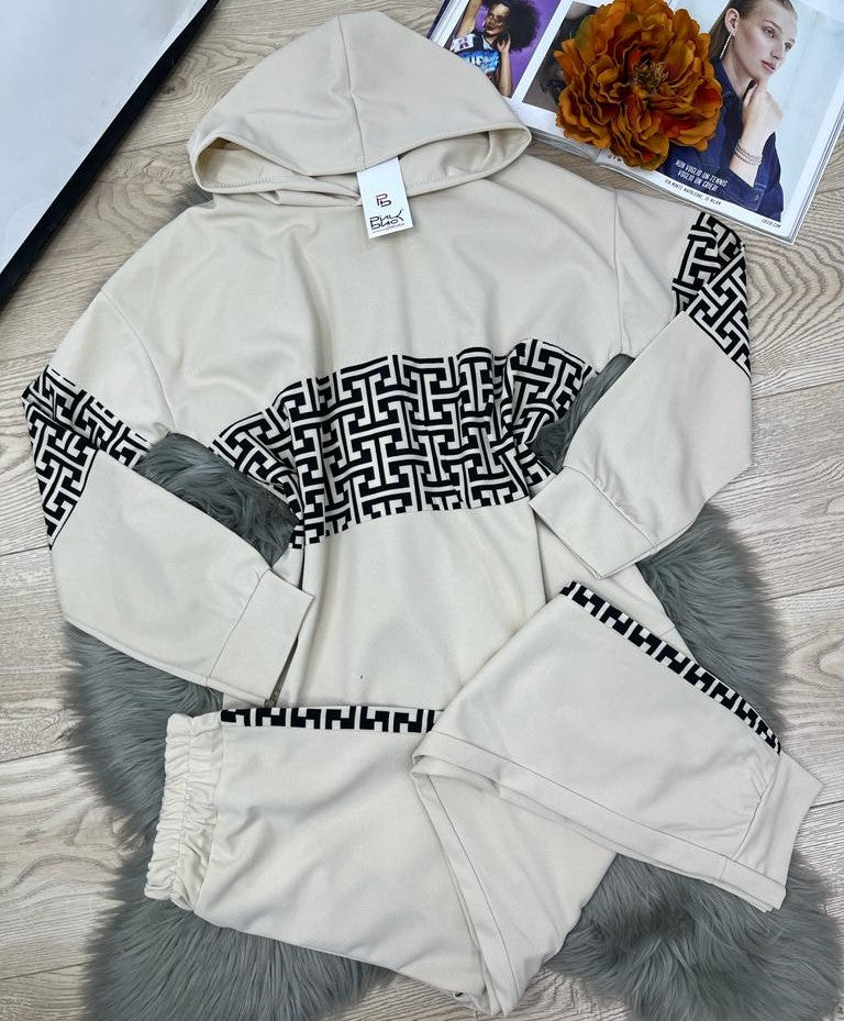 Completo felpa -pantalone in tessuto scuba crepe a fantasia. Felpa con cappuccio e pantalone con elastico in vita. Fabbricato in Italia.