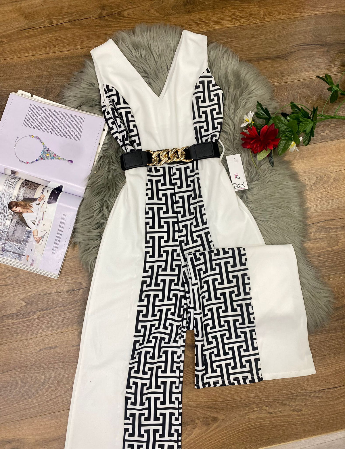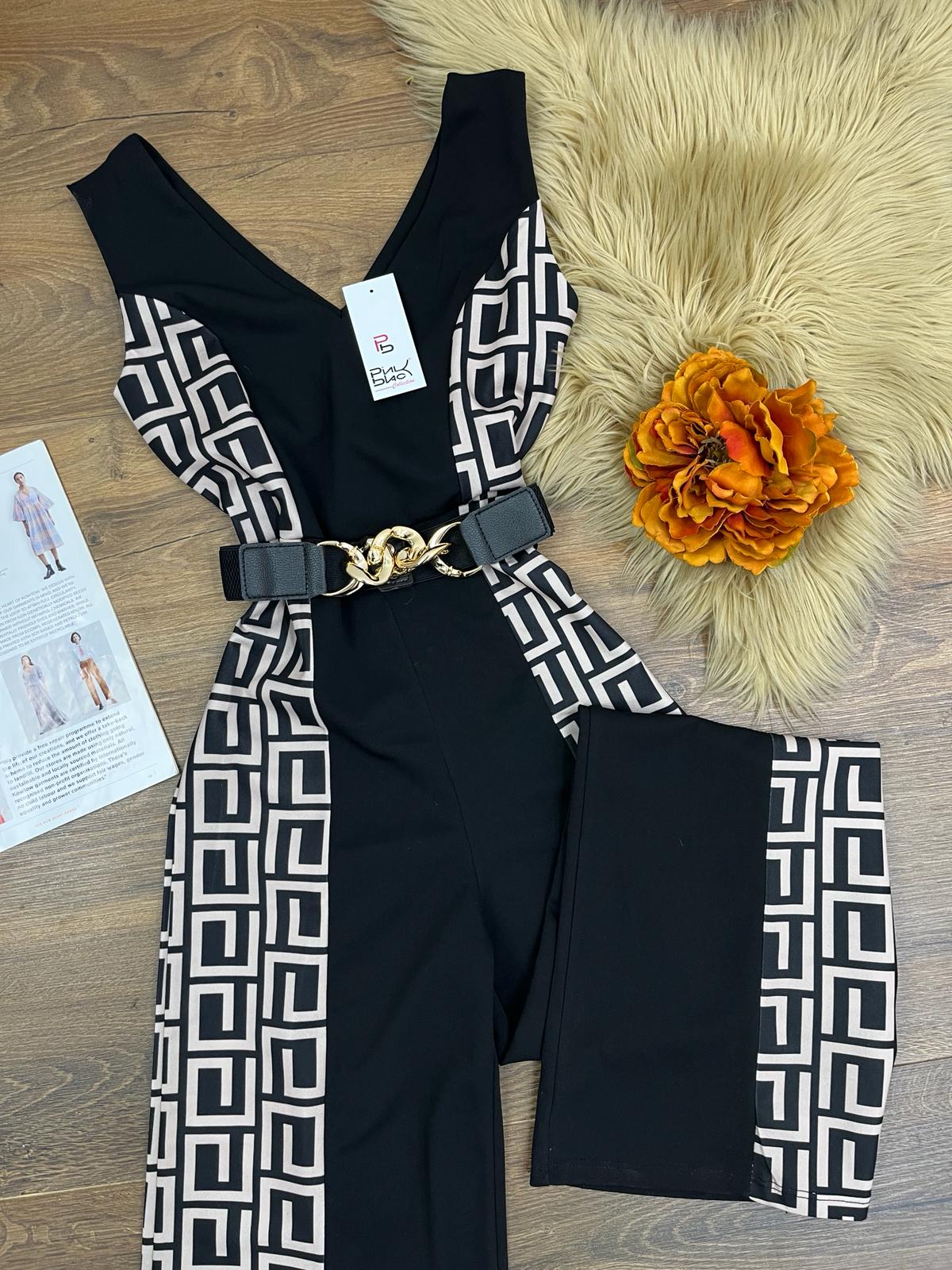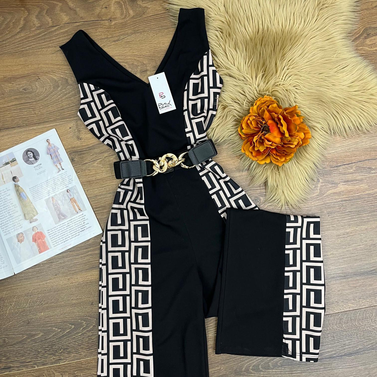 Tuta in tessuto scuba crepe con pantalone palazzo e cintura inclusa. Fabbricato in Italia.