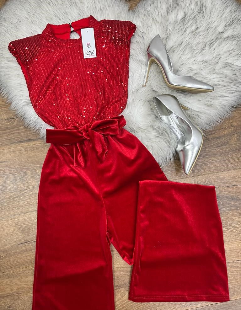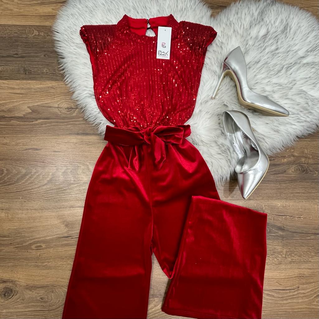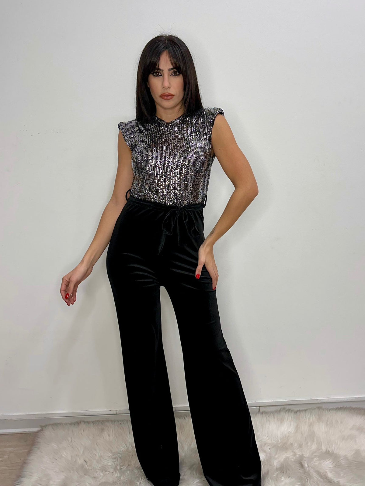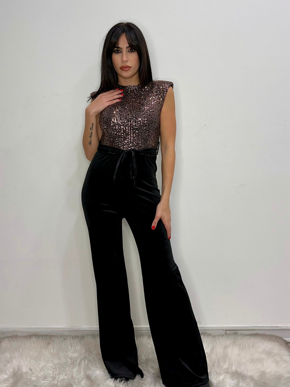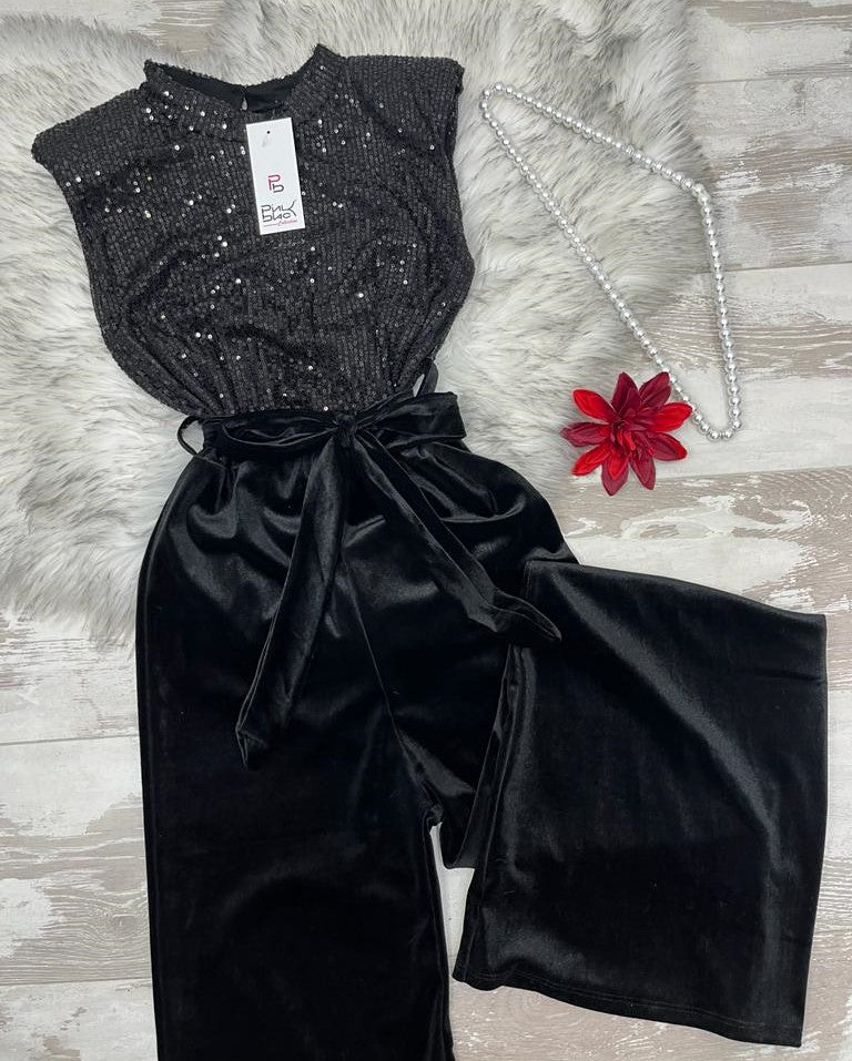 Tutina in velluto con paillettes, apertura sul retro, elastico in vita e cintura inclusa. Fabbricato all'estero.