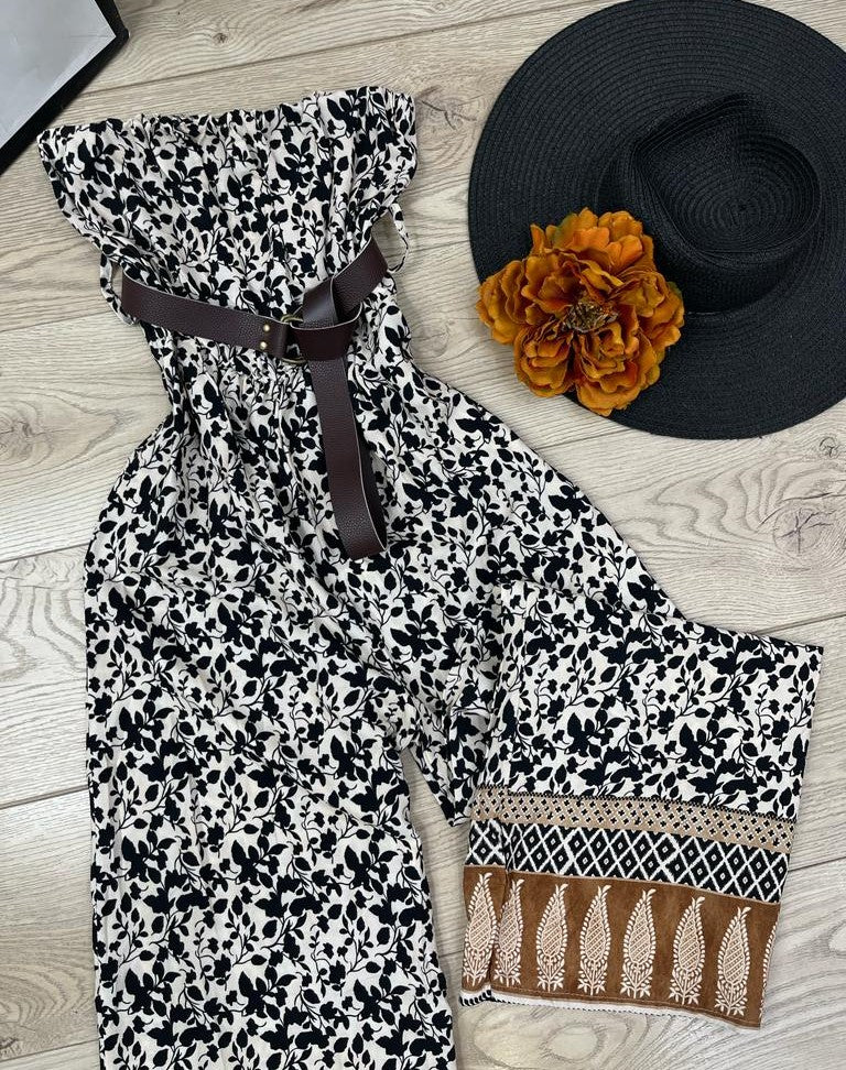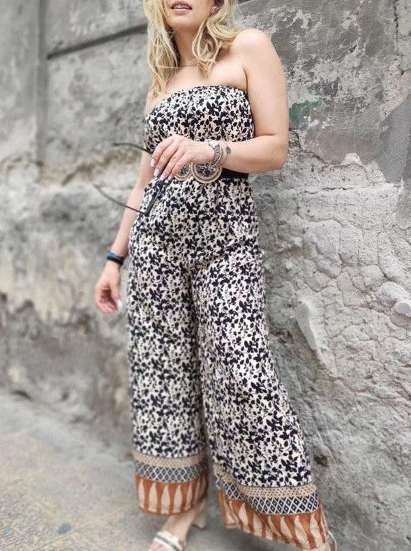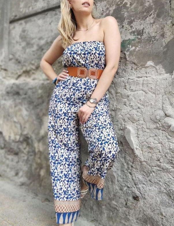 Tuta in leggero tessuto strutturato con fantasia floreale, elastico in vita sul retro, pantalone palazzo, tasche e cintura inclusa. Fabbricato in Italia.