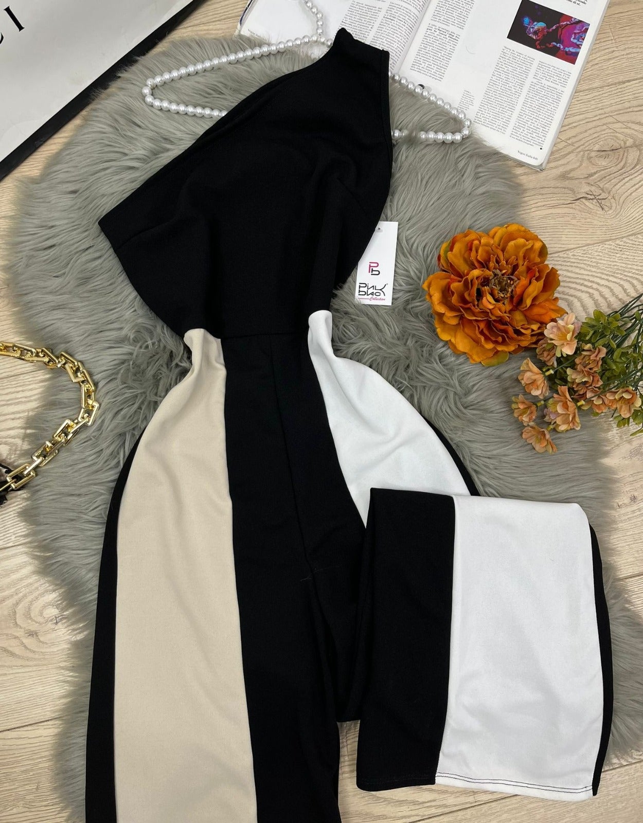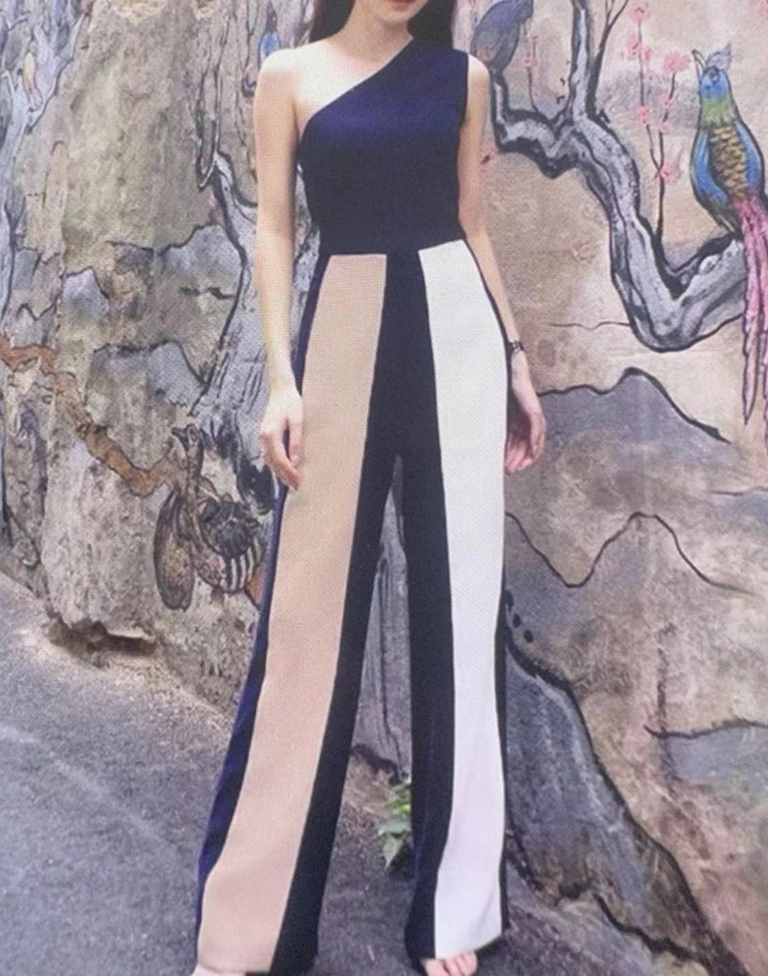 Tuta in tessuto scuba crepe monospalla, con pantalone palazzo. Fabbricato in Italia.