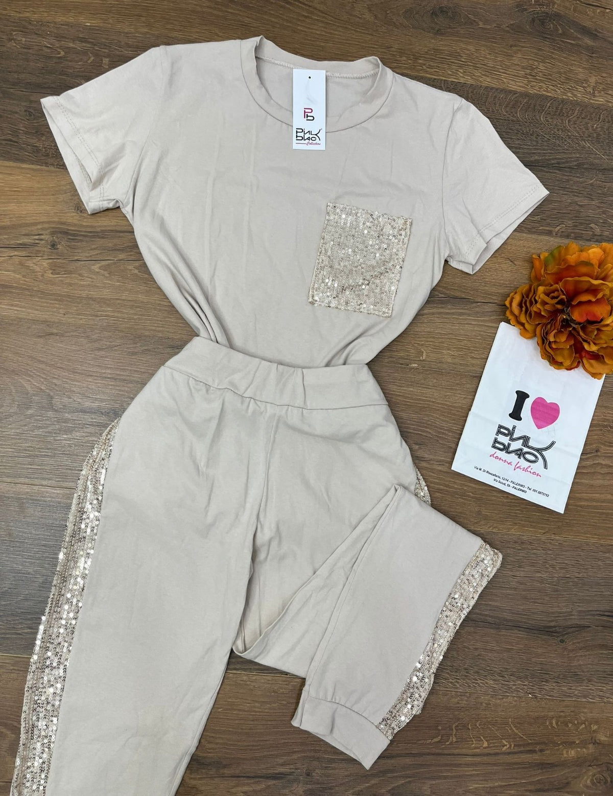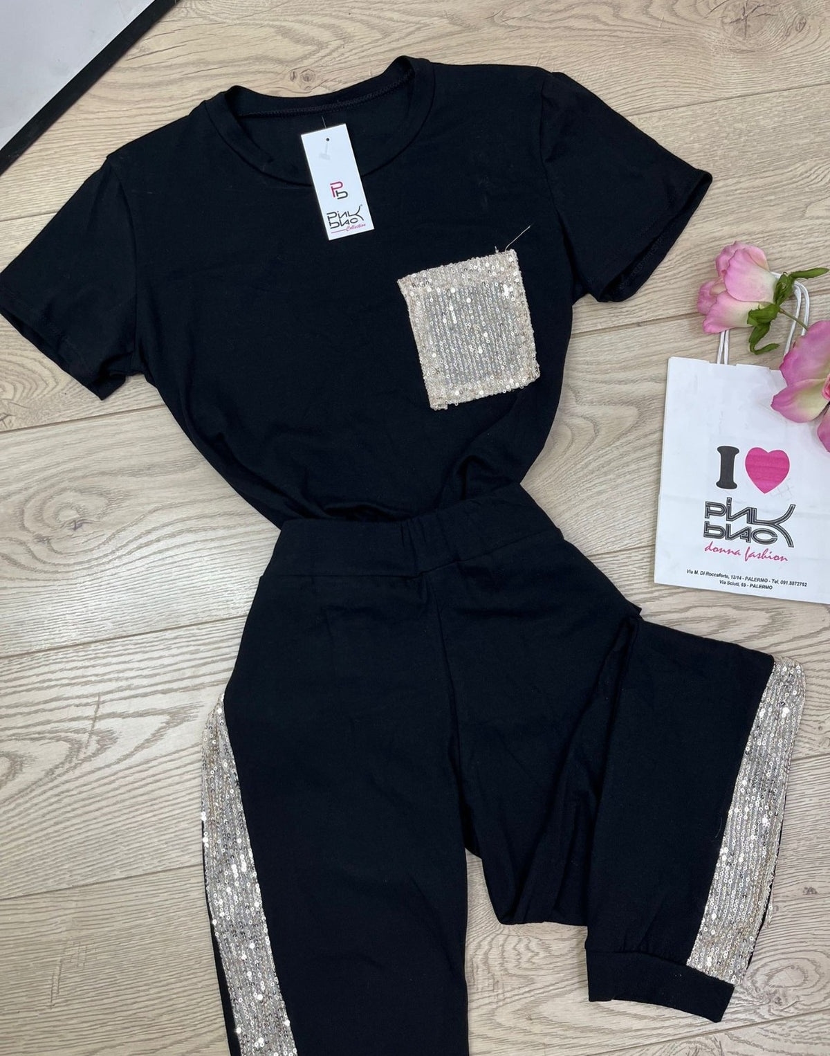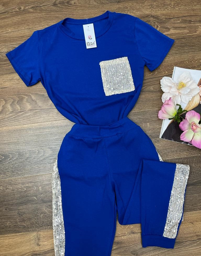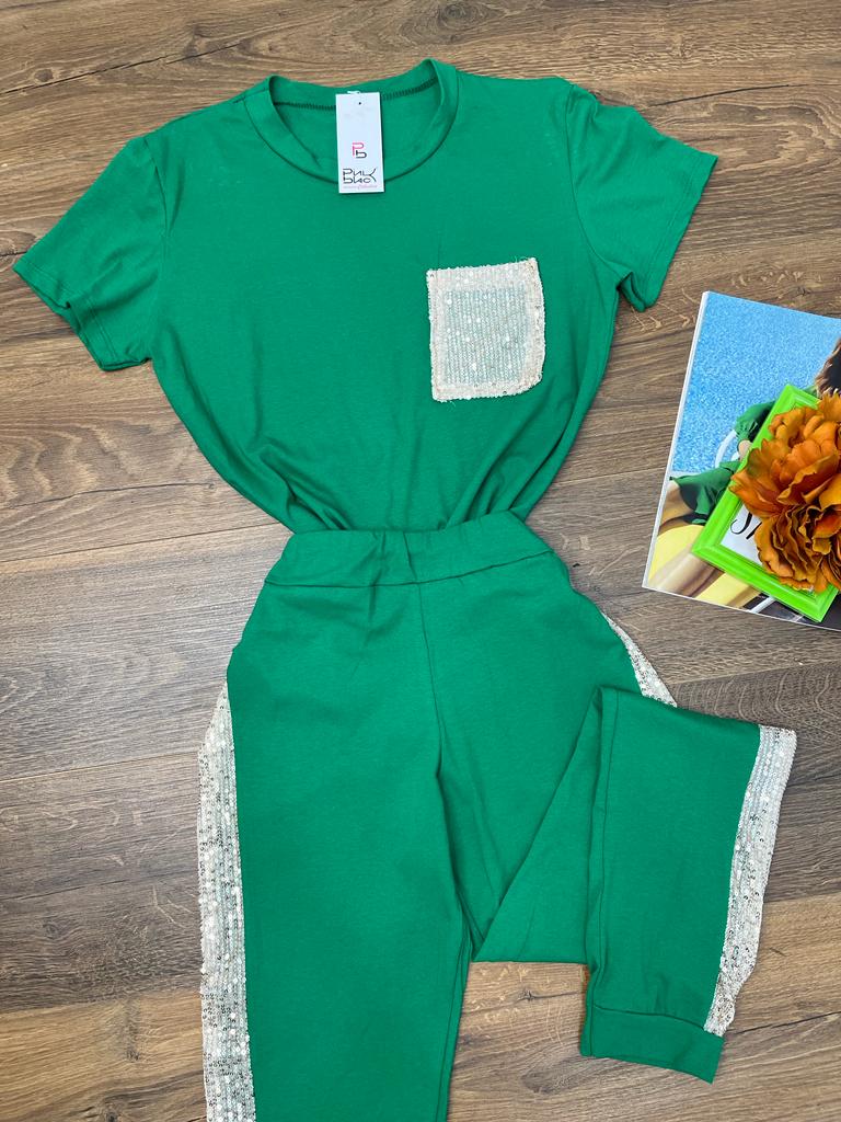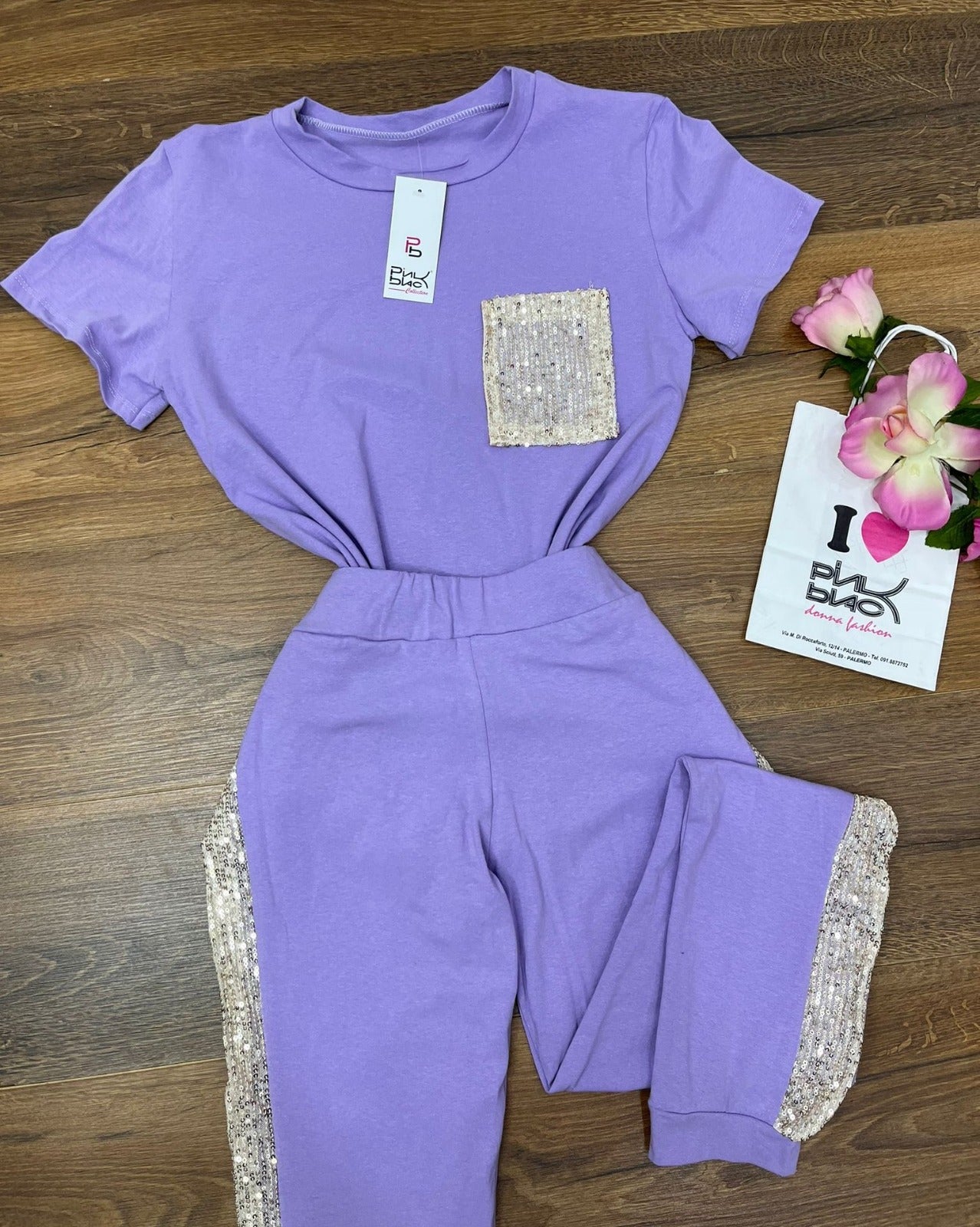 Completo tuta maglia - pantalone con applicazione di paillettes. Fabbricato in Italia.