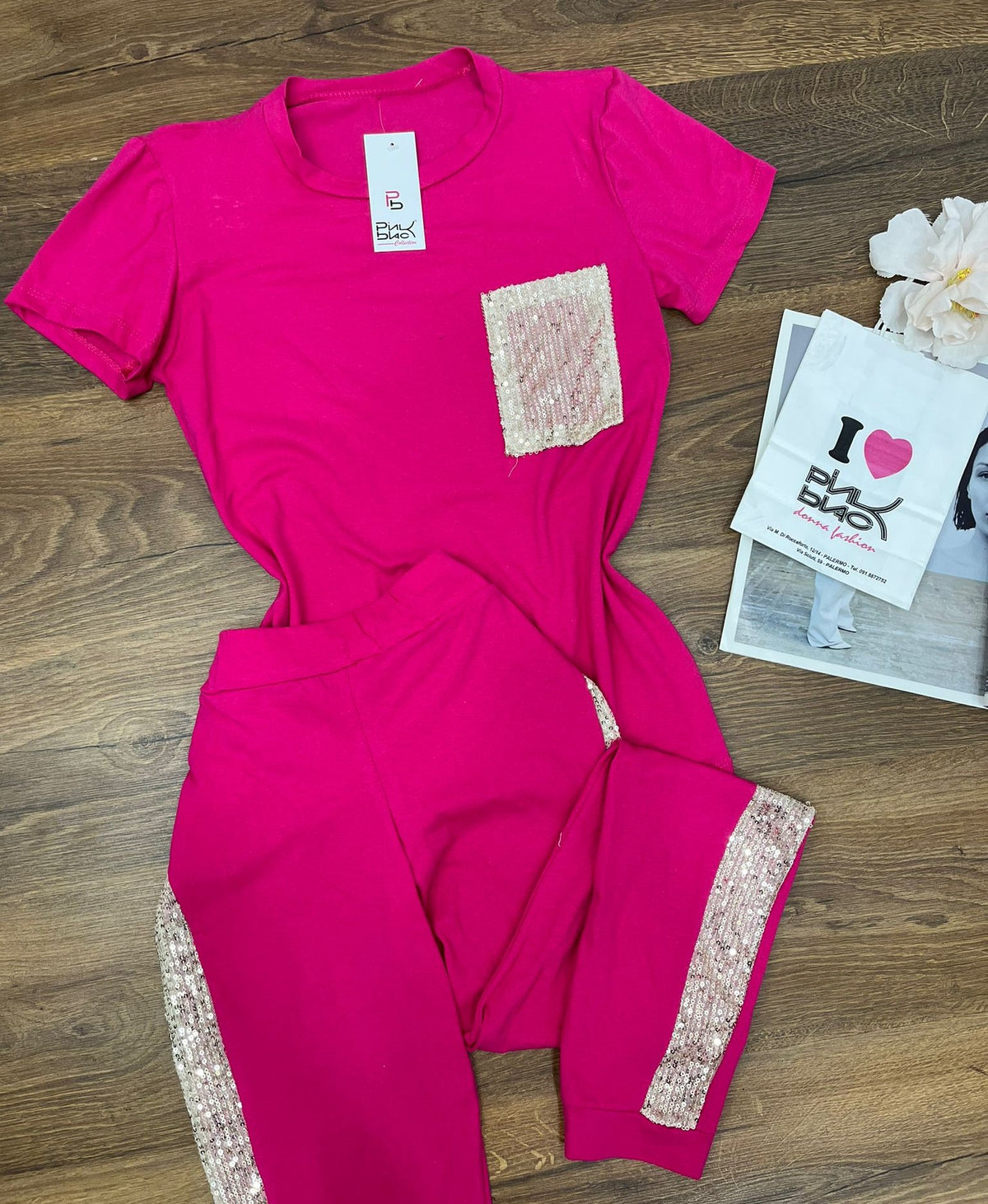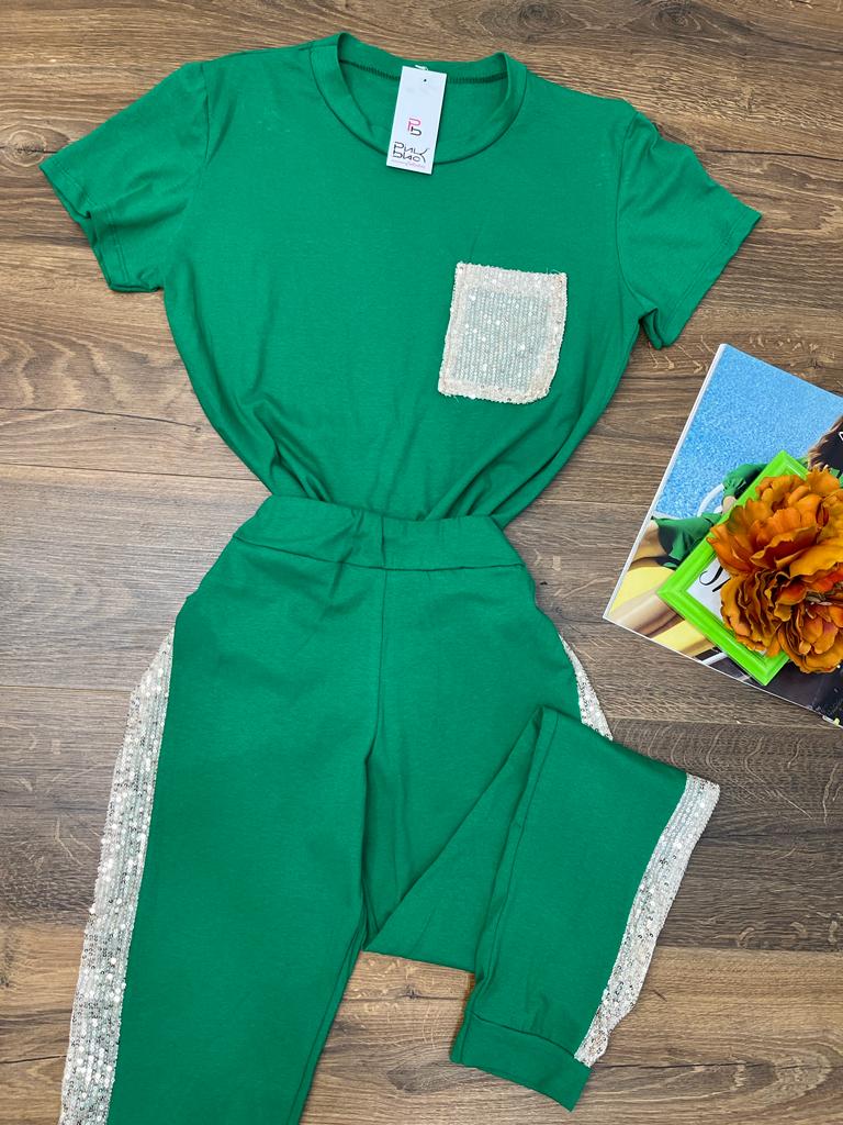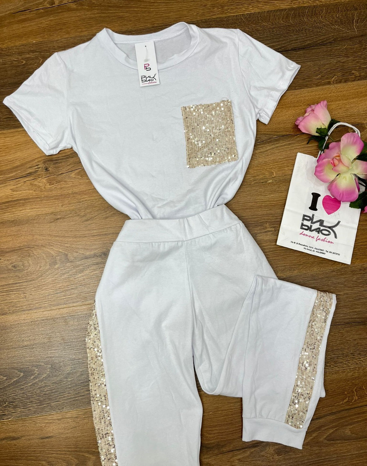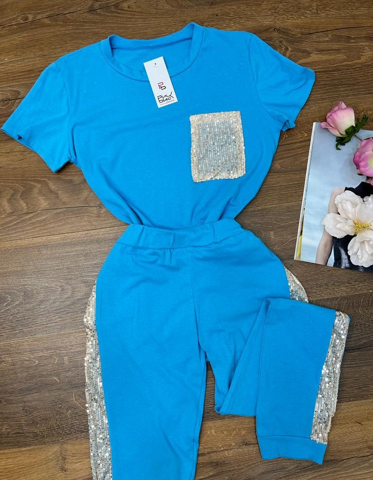 Completo tuta maglia - pantalone con applicazione di paillettes. Fabbricato in Italia.