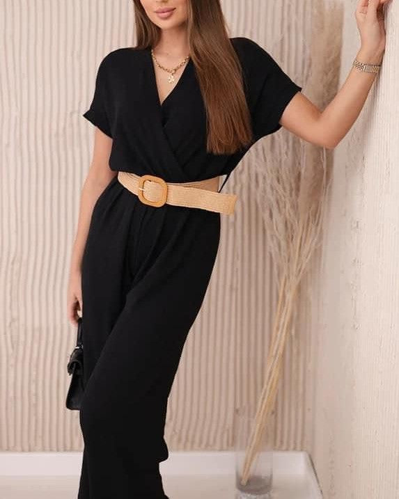 Tuta in tessuto scuba crepe a manica corta con elastico in vita , pantalone modello capri e cinturone incluso. Fabbricato in Italia.